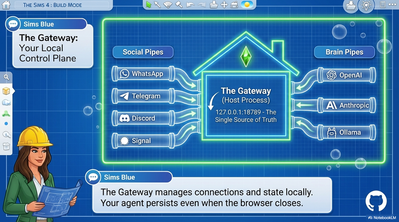 The Gateway is the control center - a long-running process on your machine (127.0.0.1:18789 by default) that connects the AI model to everything else. It manages your channel connections, maintains sessions, and tells the AI model in real time what it's currently capable of doing. Configuration and session state persist across restarts.
